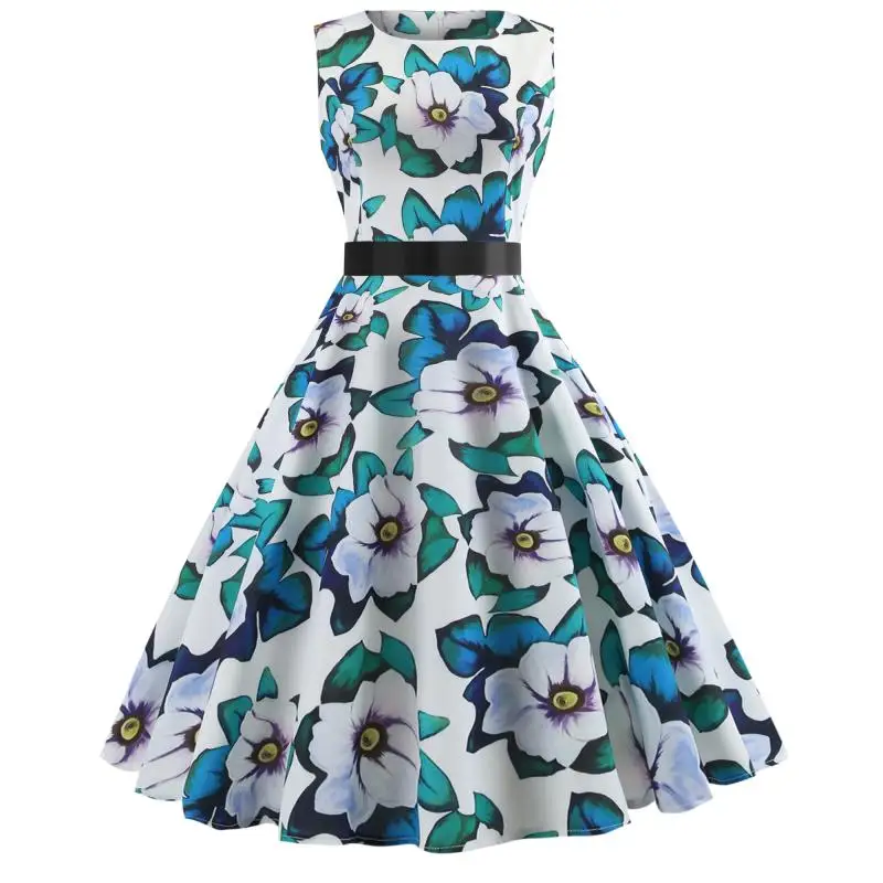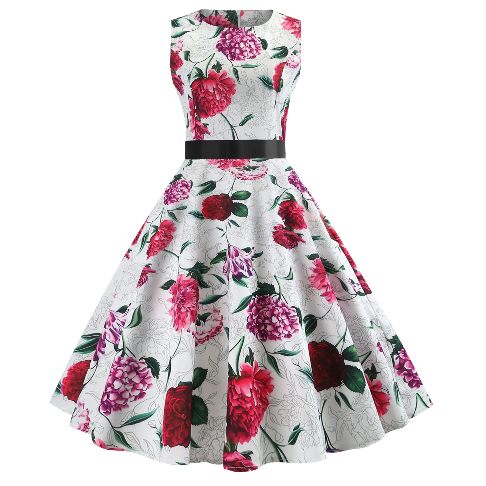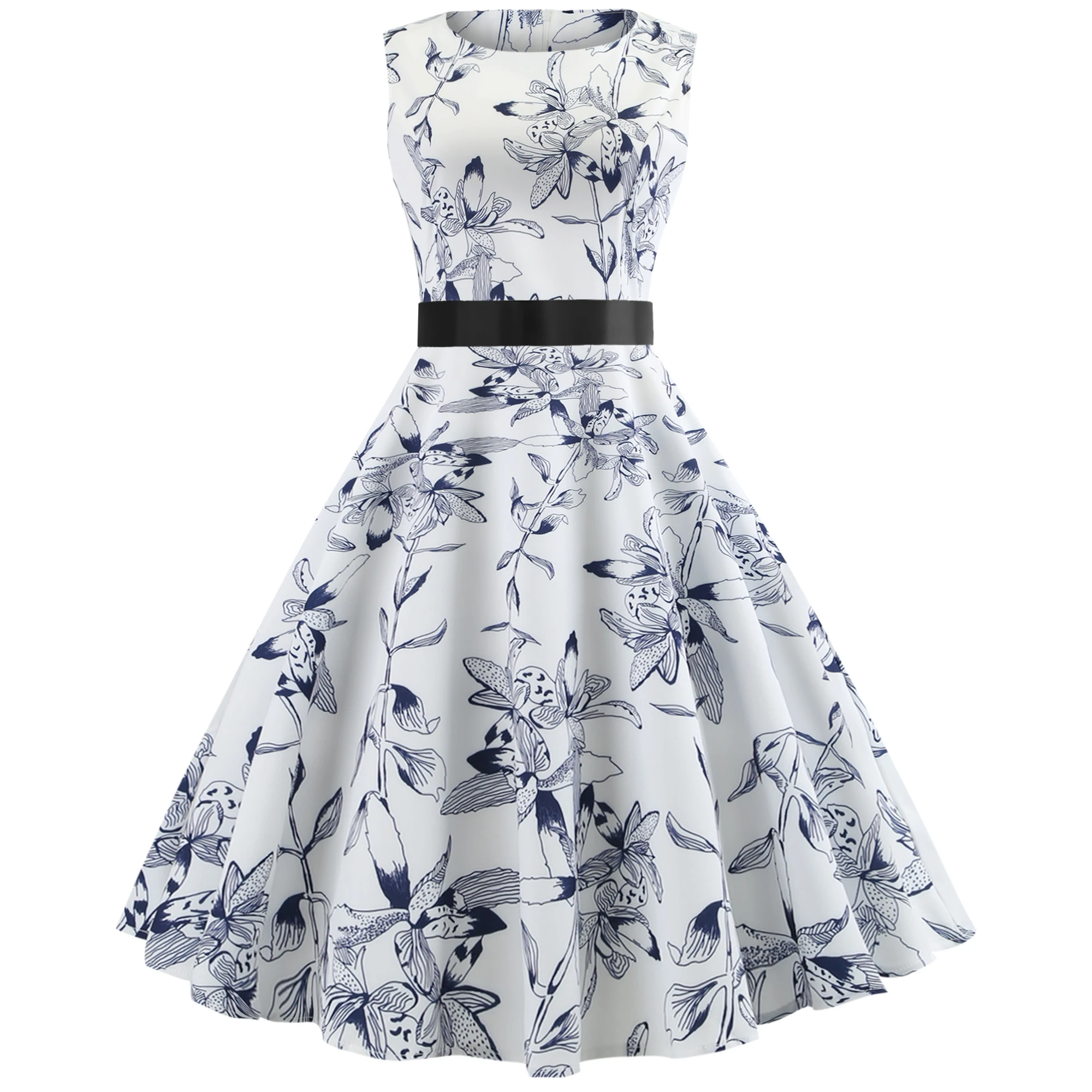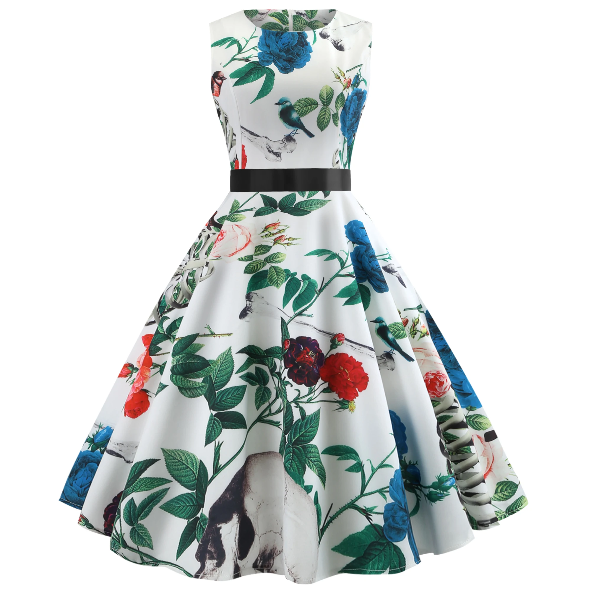 Bebovizi Fashion 2019 Summer Women Hepburn 50s Vintage Floral Print Sleeveless Retro Swing Casual Elegant Party Bandage Dress