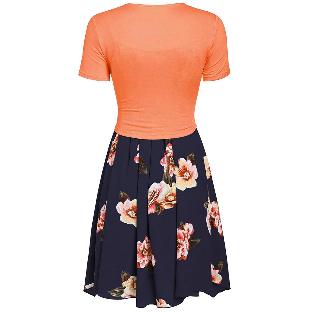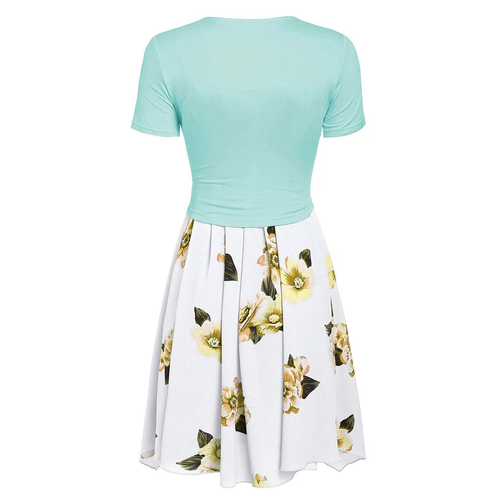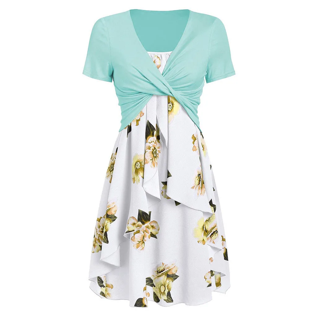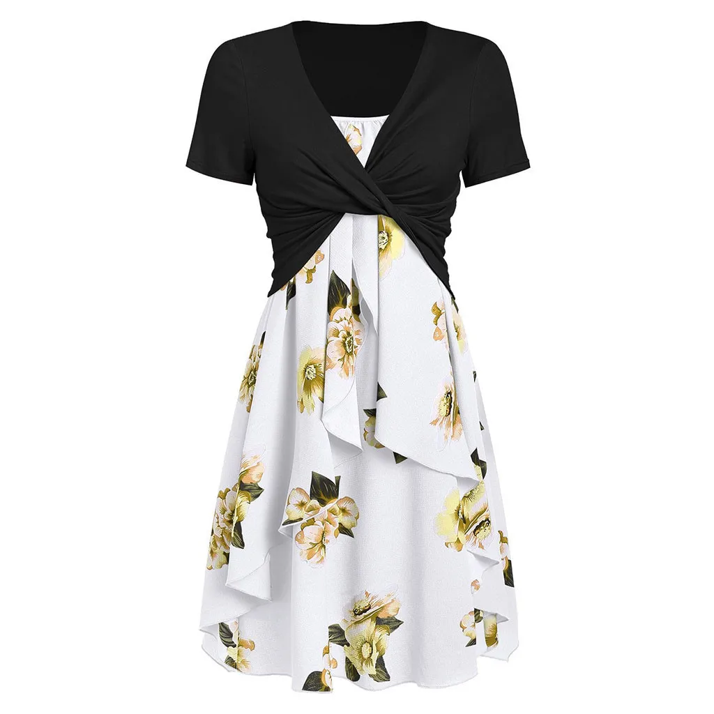Women Fashion Short Sleeve Front Criss Cross Top + Floral Print Mini Dress Suits