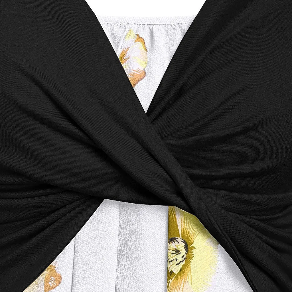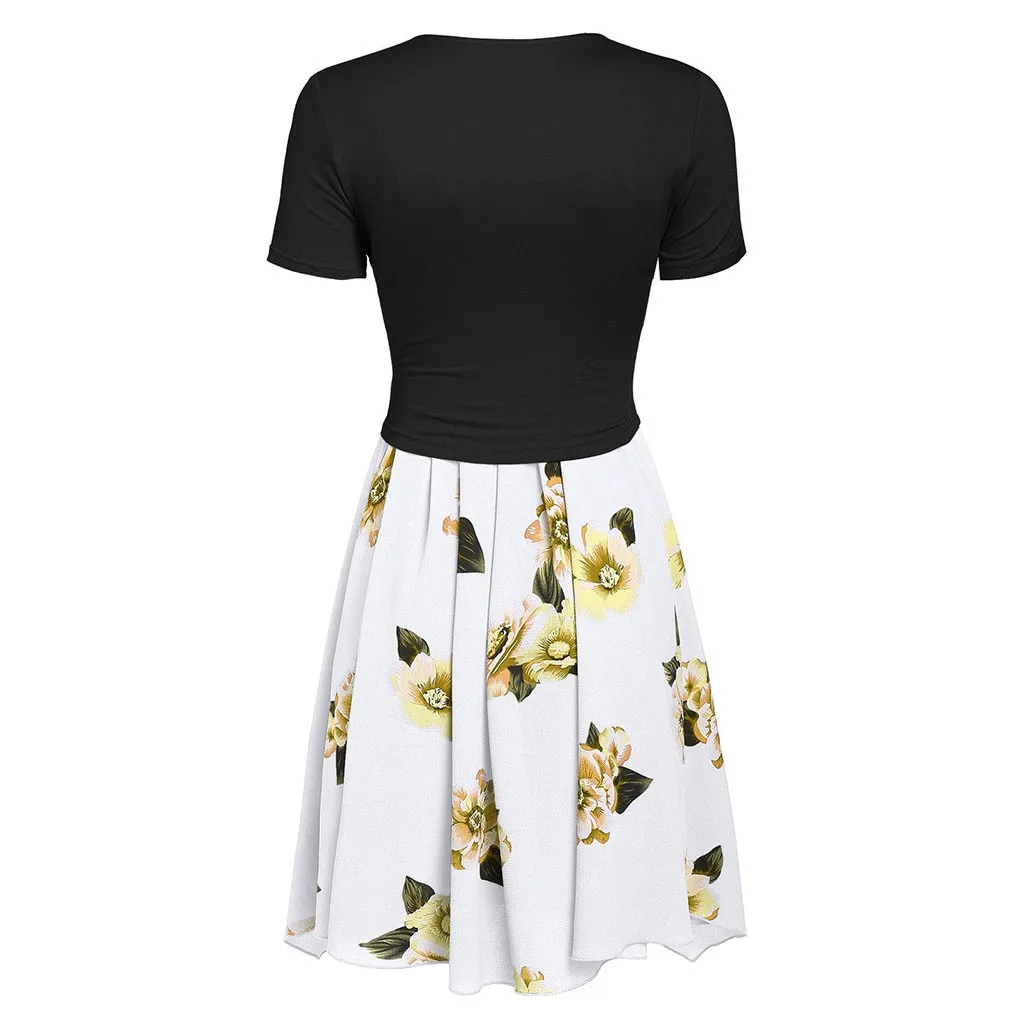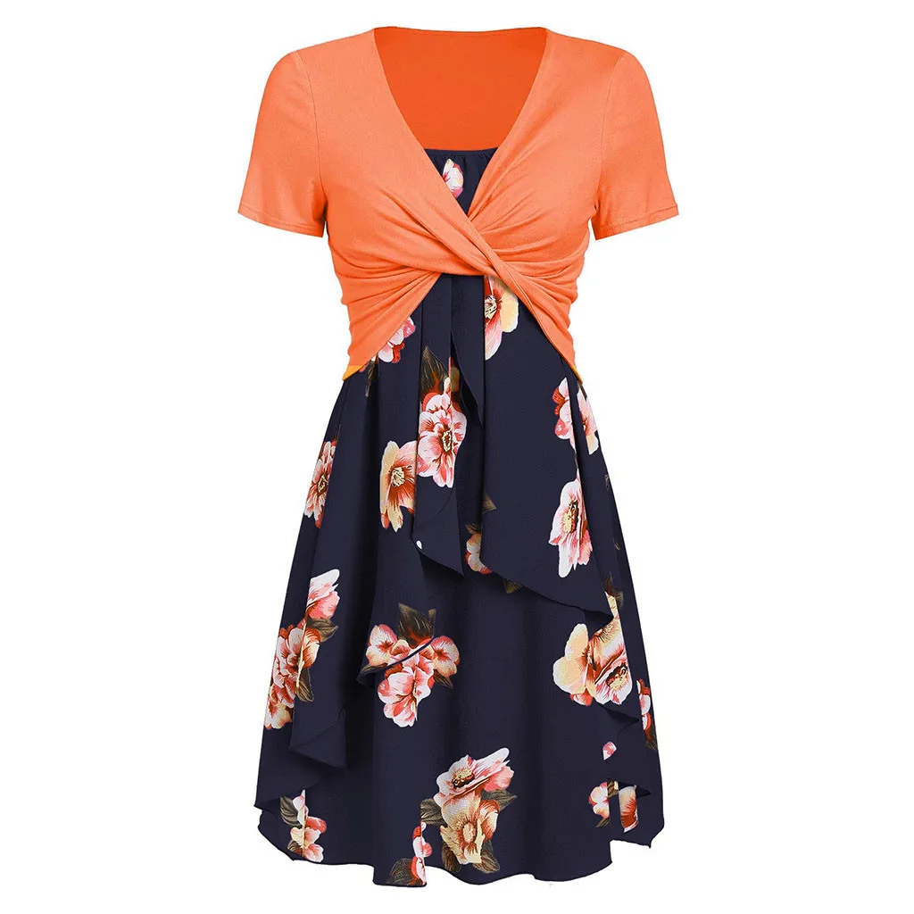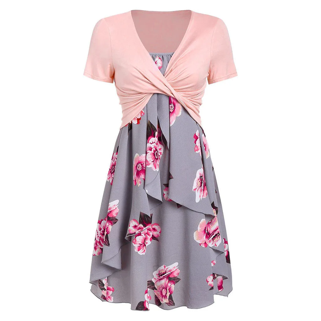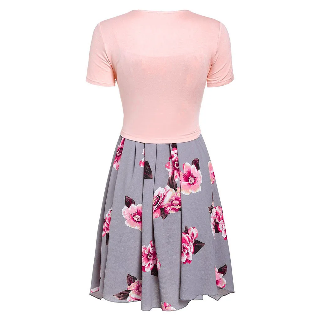 Women Fashion Short Sleeve Front Criss Cross Top + Floral Print Mini Dress Suits