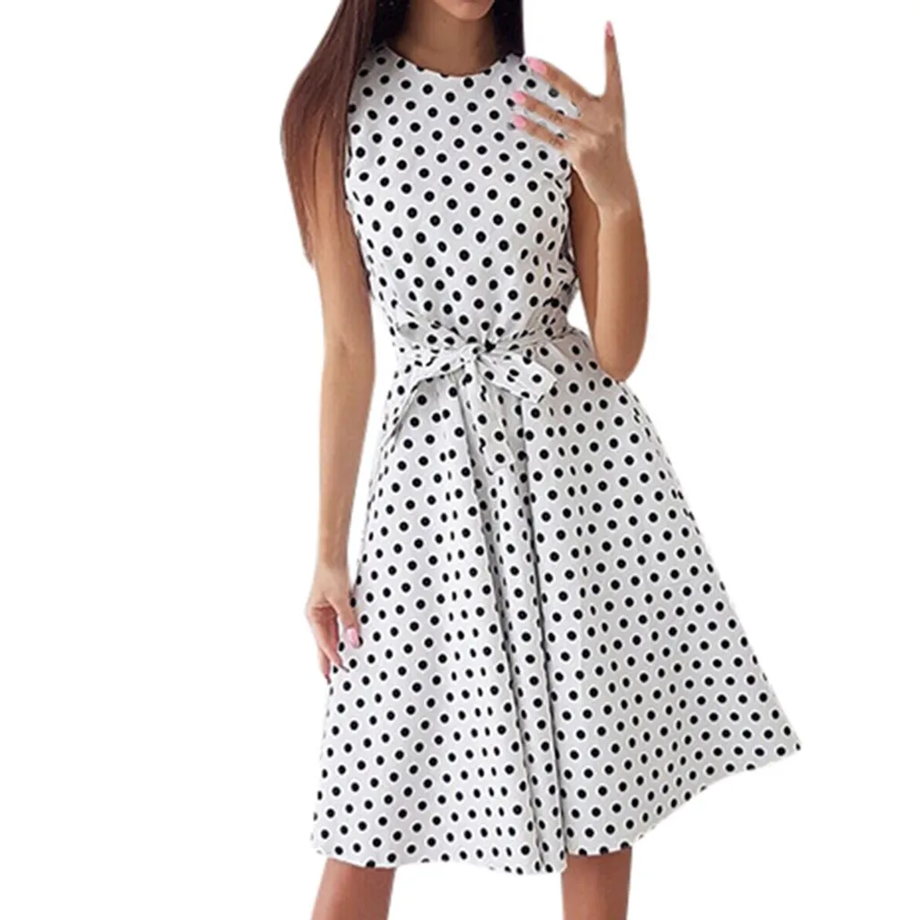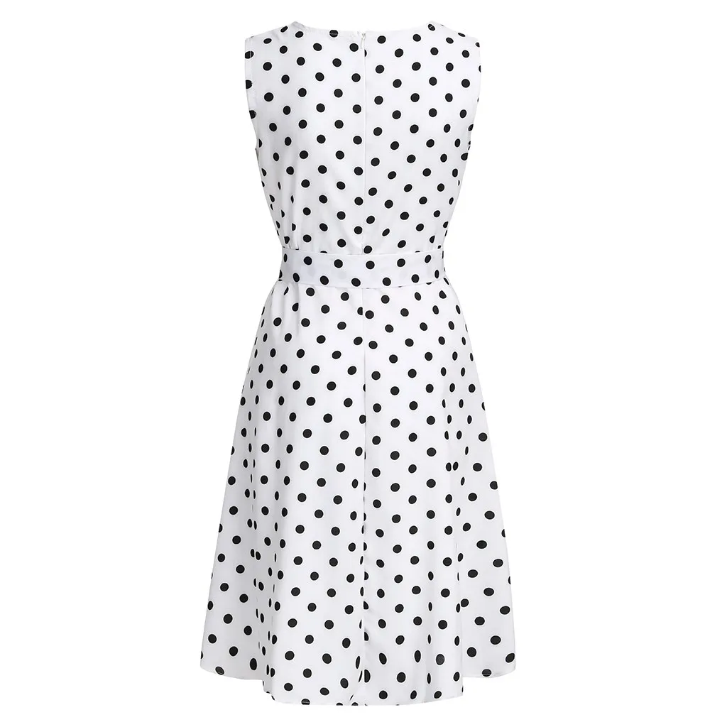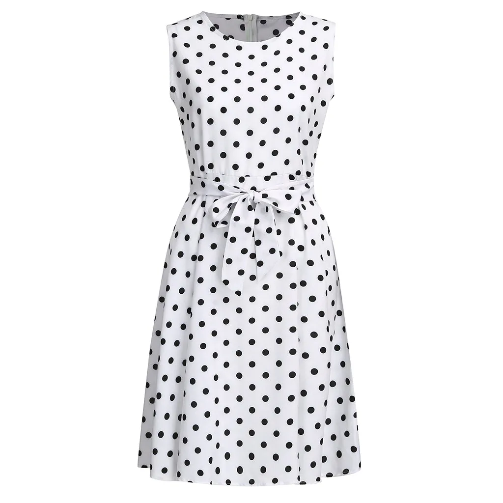Ladys Summer Sleeveless Dot Print Sleeveless Round Collar Lace Up Dress