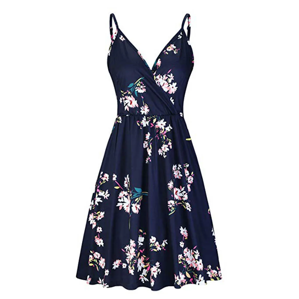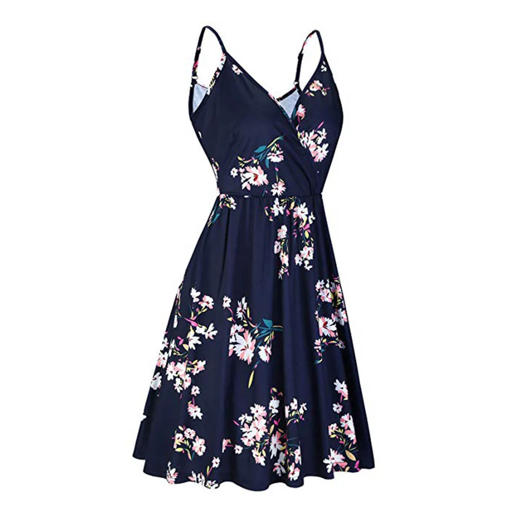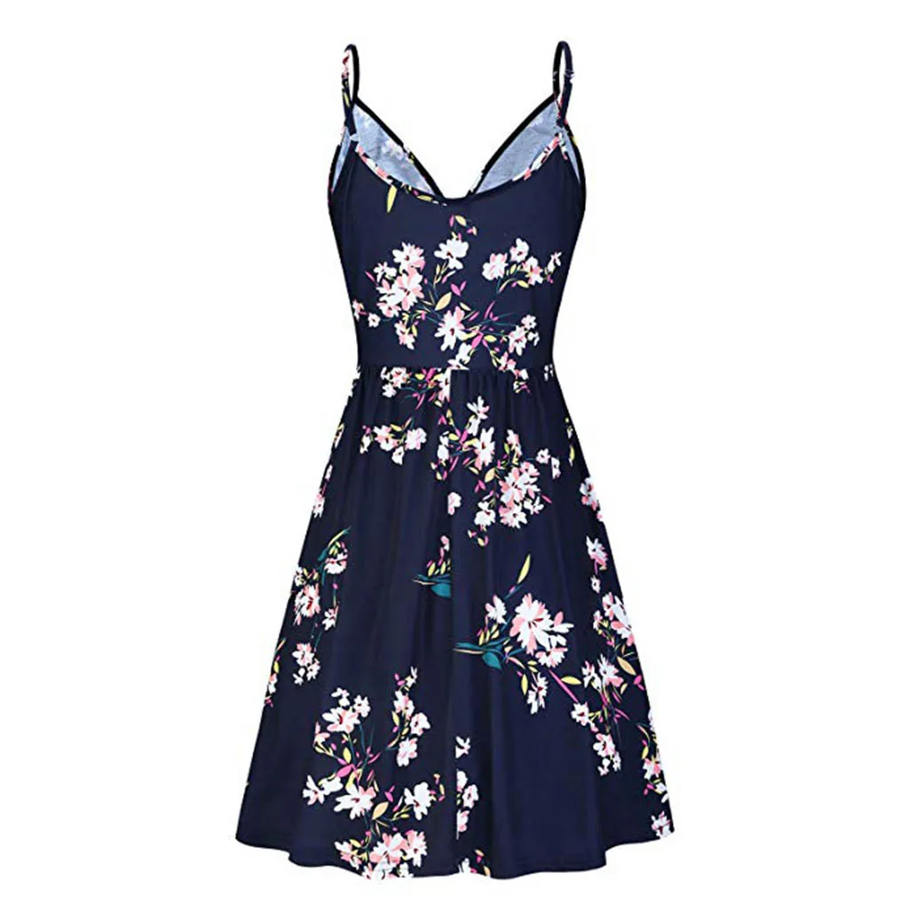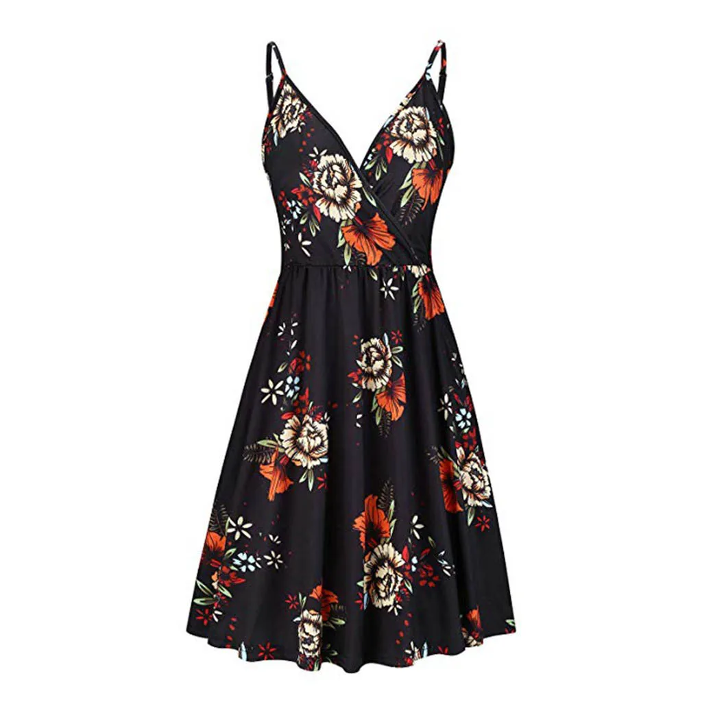 Women's Vintage Printed Sleeveless Strappy Summer Beach Swing Camis Dress